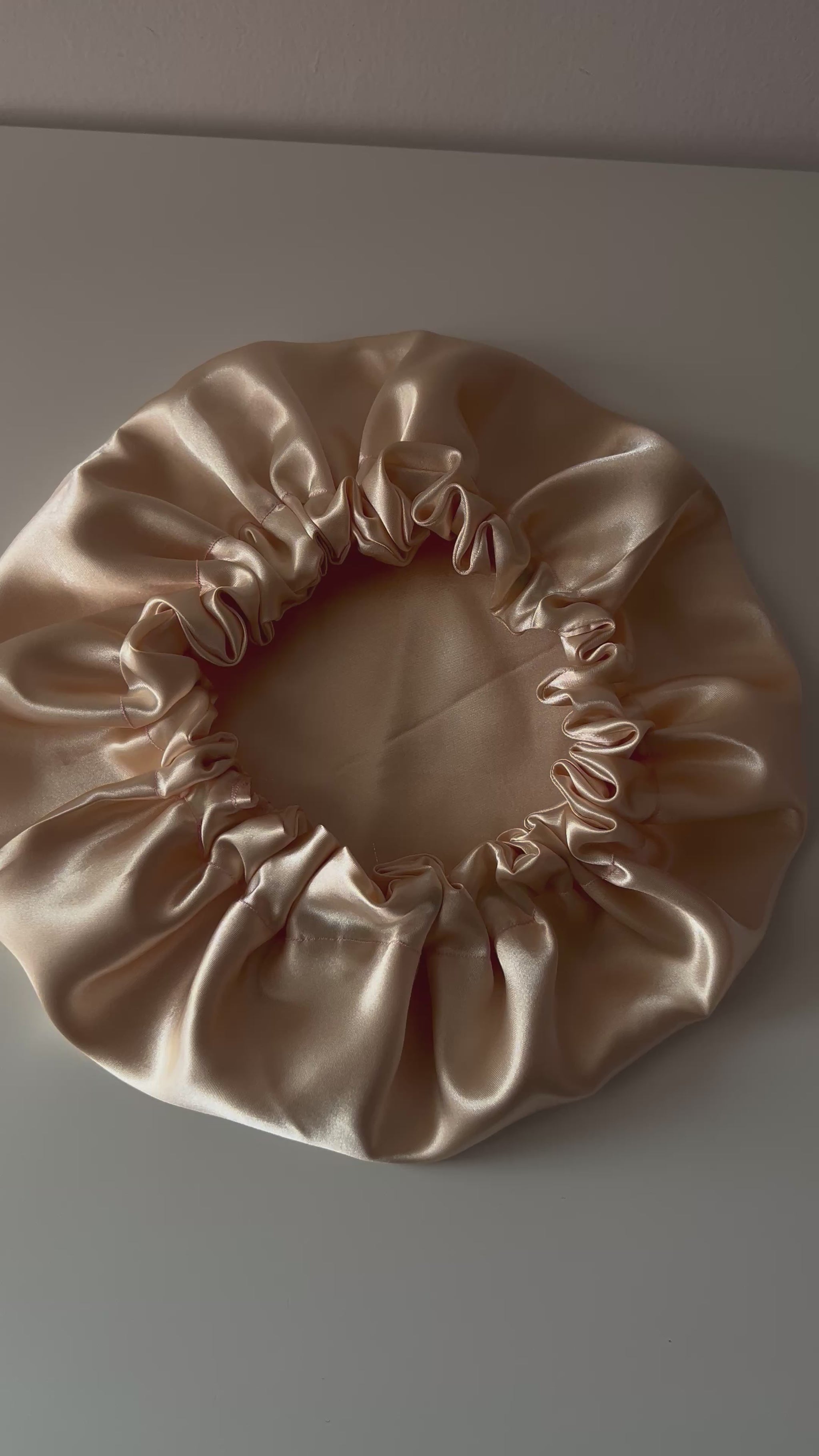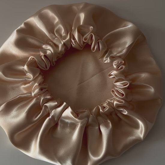 Our Champagne Cream Bonnet is the definition of luxury and sophistication. The smooth satin fabric protects your hair while keeping it hydrated and tangle-free.